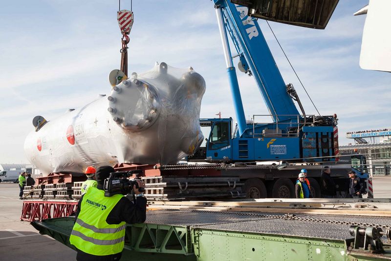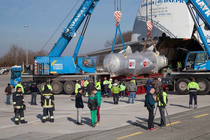 Na naloženie stroja sa použili dva žeriavy Terex s maximálnou nosnosťou každého 120 ton. Na tento účel boli komponenty vyzdvihnuté na rampu a následne pomocou kladkostrojov presúvané do stroja a zaistené. Časti zariadenia sú určené pre podnik na výrobu umelých hnojív v Saudskej Arábii.
