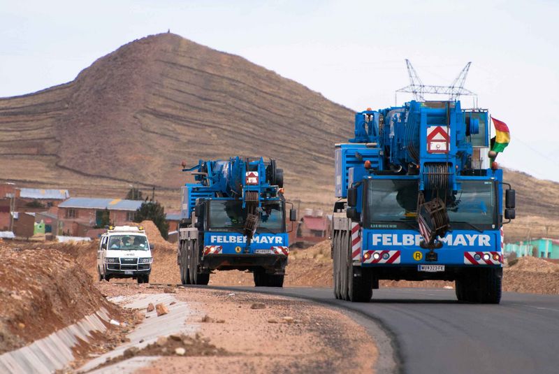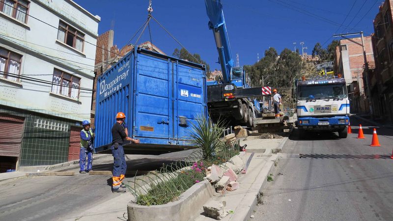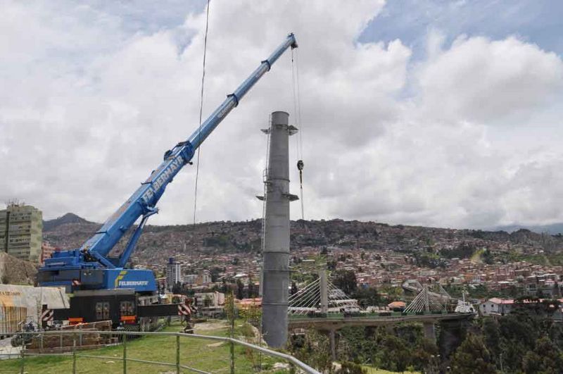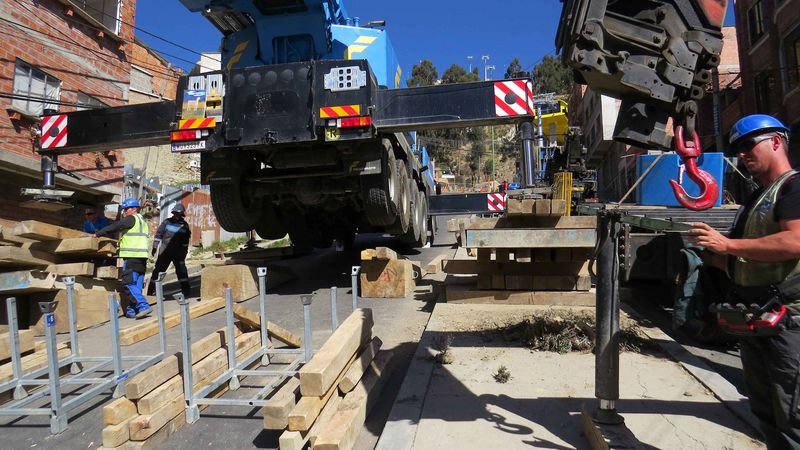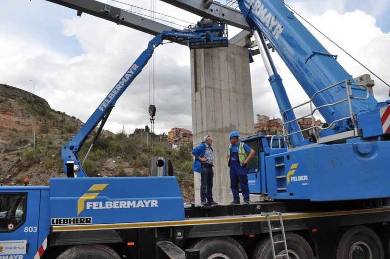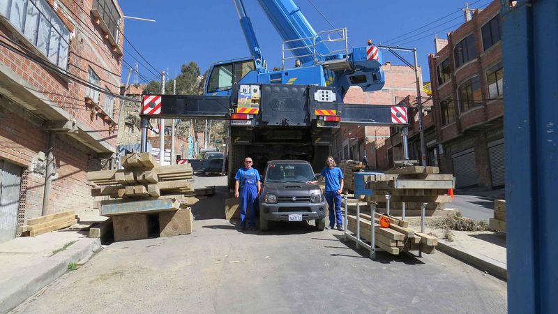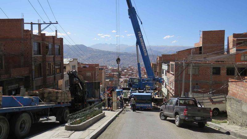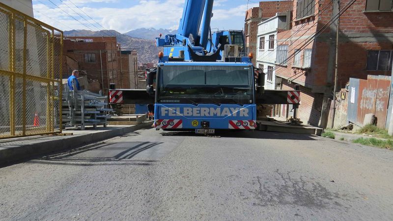 Na základe pozitívnych skúseností so žeriavmi Liebherr vo veľkých výškach padlo s rozhodnutím pre Bolíviu takisto rozhodnutie pre zariadenia od výrobcu žeriavov z Ehingenu. Na cestu na stavenisko do Bolívie boli zariadenia s hmotnosťou 160, 130 a 90 ton spolu s kĺbovými teleskopickými a nožnicovými pracovnými plošinami, ako aj teleskopickými stohovačmi nalodené v prístave Bremerhaven a následne po dobrodružnej ceste prepravené z čilského prístavu Iquique na stavenisko do La Paz. Namáhavý bol nielen príjazd v dĺžke 1 000 kilometrov s približne 5 000 výškovými metrami, ale mnohé výzvy v sebe skrývala aj samotná práca na tomto mieste: „Výtlky boli hlboké až do pol metra a takisto nesmieme podceňovať hrbole na vozovke“, vysvetľuje Gsaller. Okrem toho aj stúpania približne 18 percent nie sú žiadnou zriedkavosťou. „Pre automatickú prevodovku sú to nepredvídané zaťaženia, medzičasom sme ju museli nechať vždy vychladnúť.“